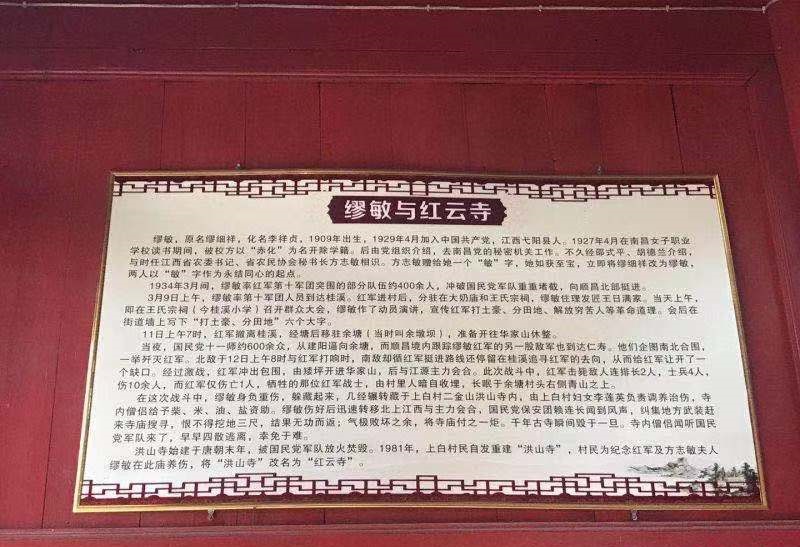 缪敏在一次战斗中不幸负伤,几经辗转藏于二金山洪山寺内,由上白村妇女李莲英负责调养治伤(目击者赖家宝)。寺内僧侣给予柴、米、油、盐资助。缪敏伤好后迅速转移北上江西与红军主力会合,后来去了延安。顺昌县城国民党保安团赖连长闻到风声,纠集地方武装赶来寺庙搜寻无果,将寺庙付之一炬,毁于一旦。寺内僧侣闻讯早早撤离,幸免于难。1981年洪山寺重建时,村民为纪念红军及方志敏夫人缪敏,在半山腰间建一座“红军亭”,将洪山寺改名为红云寺。