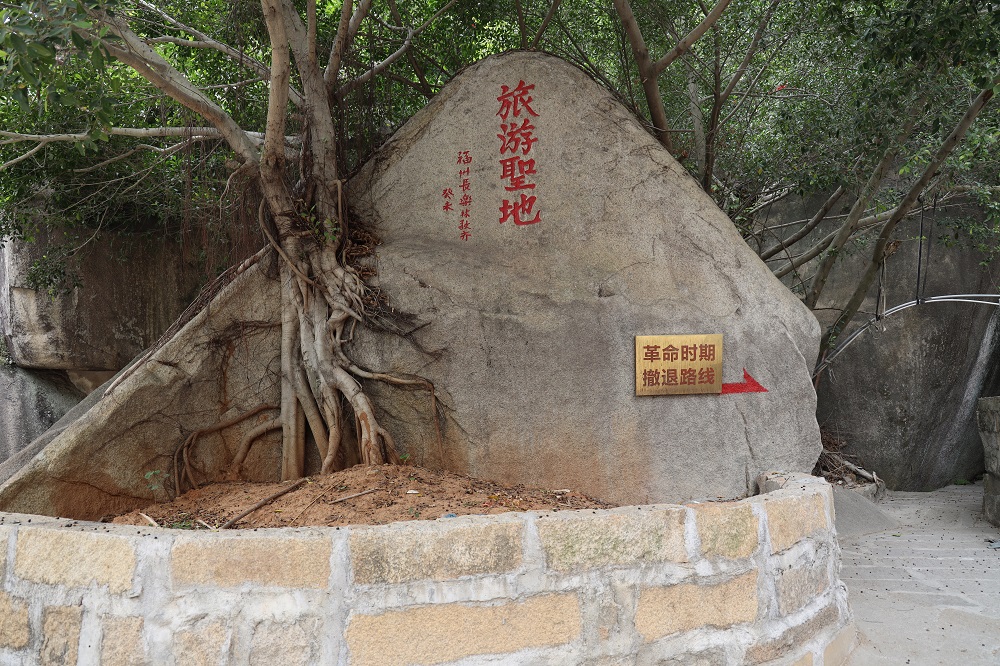 南安石室岩(佛教活动场所)位于官桥镇岭兜村,因天然巨石叠成石室,可容200余人,故称“石室岩”。在土地革命战争时期、抗日战争时期、解放战争时期,石室岩都是中国共产党地下革命活动的重要据点。在石室岩门前,有一块石碑,上面写着“中共晋南县委机关旧址”;而在石室岩的右边,巨石嶙峋中,有一条仅能容一人侧身通过的一线天,边上的石头上同样挂着一块牌匾:革命时期撤退路线。